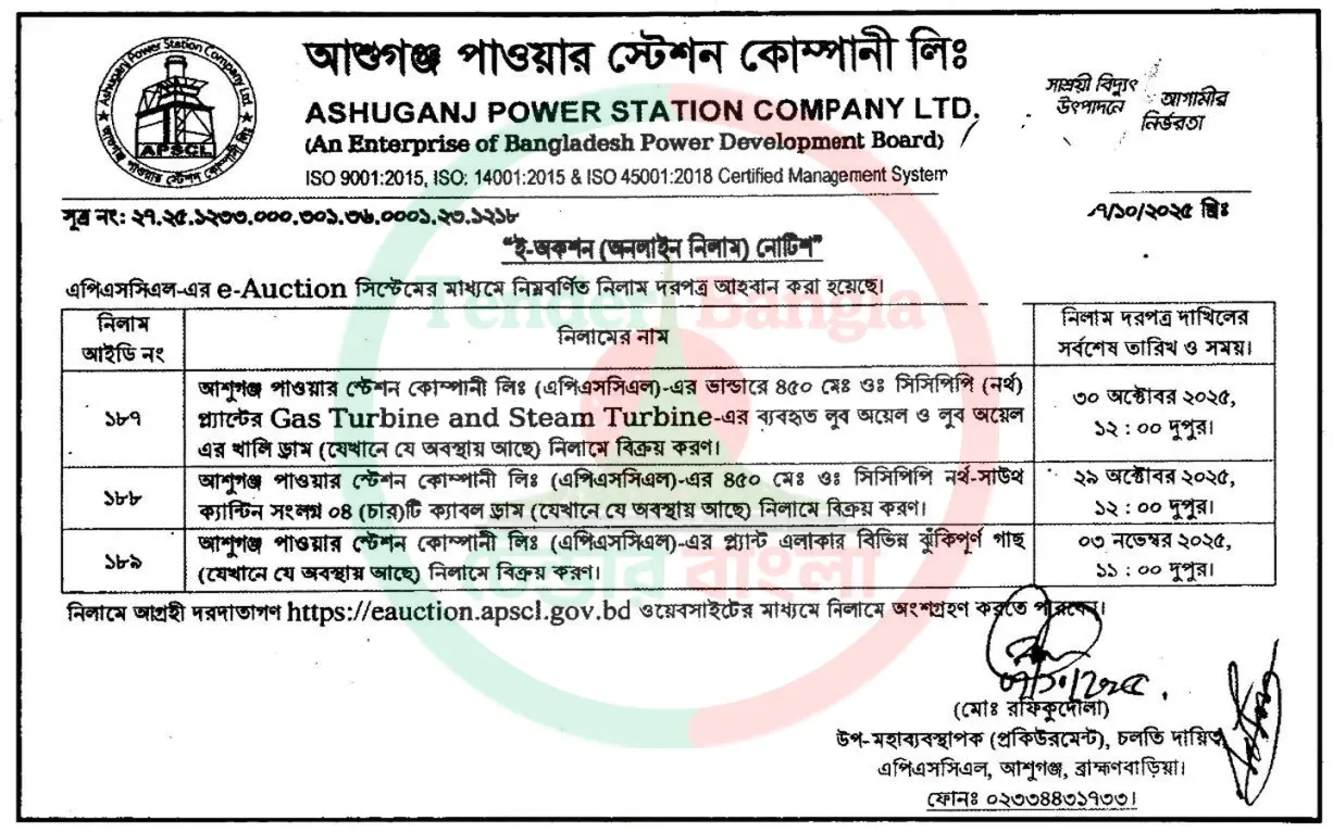 Title: ই অকশন বিজ্ঞপ্তি আশুগঞ্জ পাওযার স্টেশন কোম্পানী লিঃ
