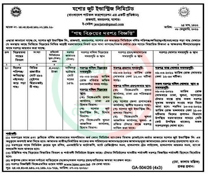 Title: গাছ বিক্রয়ের দরপত্র বিজ্ঞপ্তি যশোর জুট মিলস