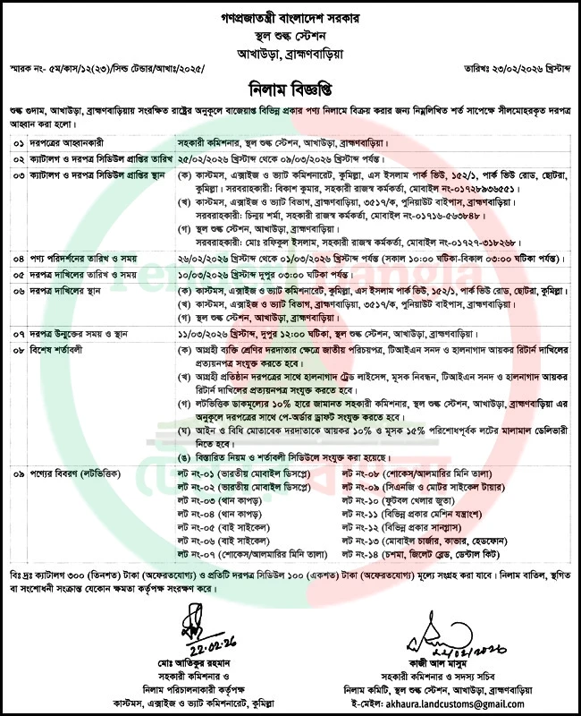 Title: বিভিন্ন প্রকার মালামাল নিলাম বিজ্ঞপ্তি স্থল শুল্ক স্টেশন
