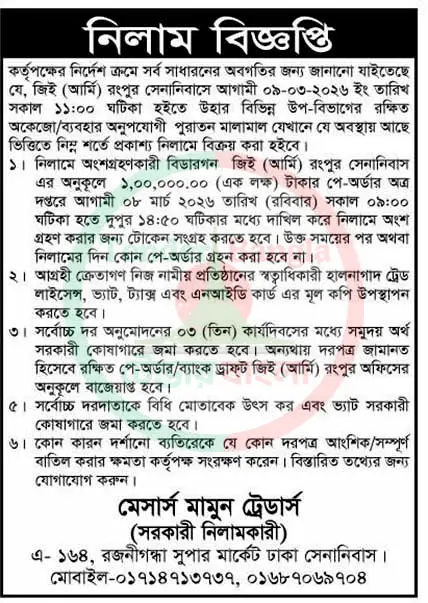 Title: রংপুর সেনানিবাসে বিভিন্ন মালামাল নিলাম বিজ্ঞপ্তি