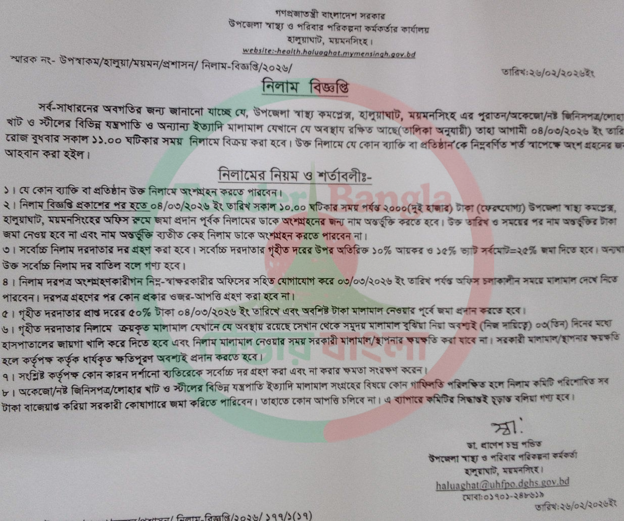 Title: উপজেলা স্বাস্থ্য ও পরিবার কেন্দ্র বিভিন্ন মালামাল নিলাম বিজ্ঞপ্তি