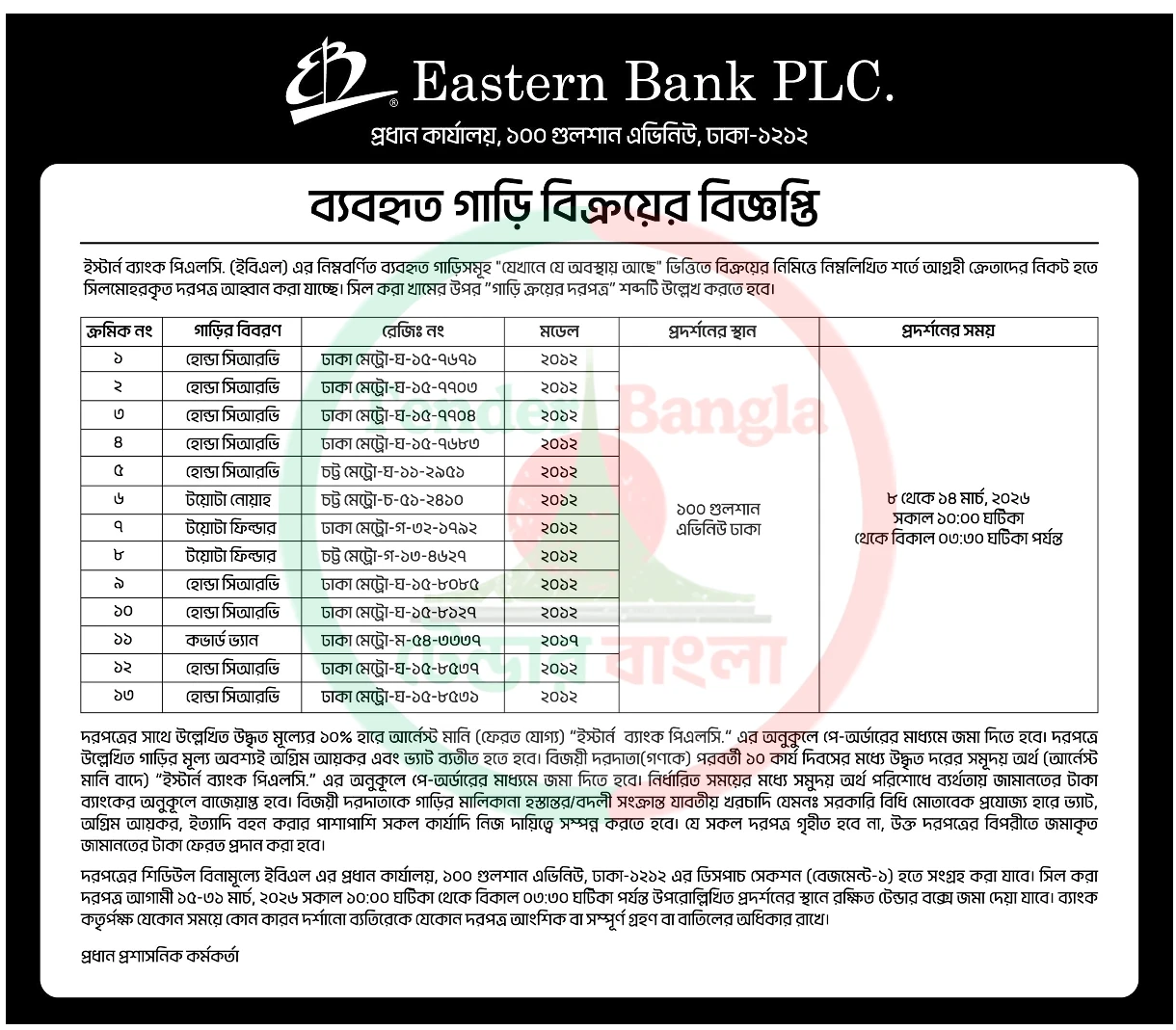 Title: ব্যবহৃত গাড়ি বিক্রয়ের বিজ্ঞপ্তি ইস্টার্ন ব্যাংক পিএলসি
