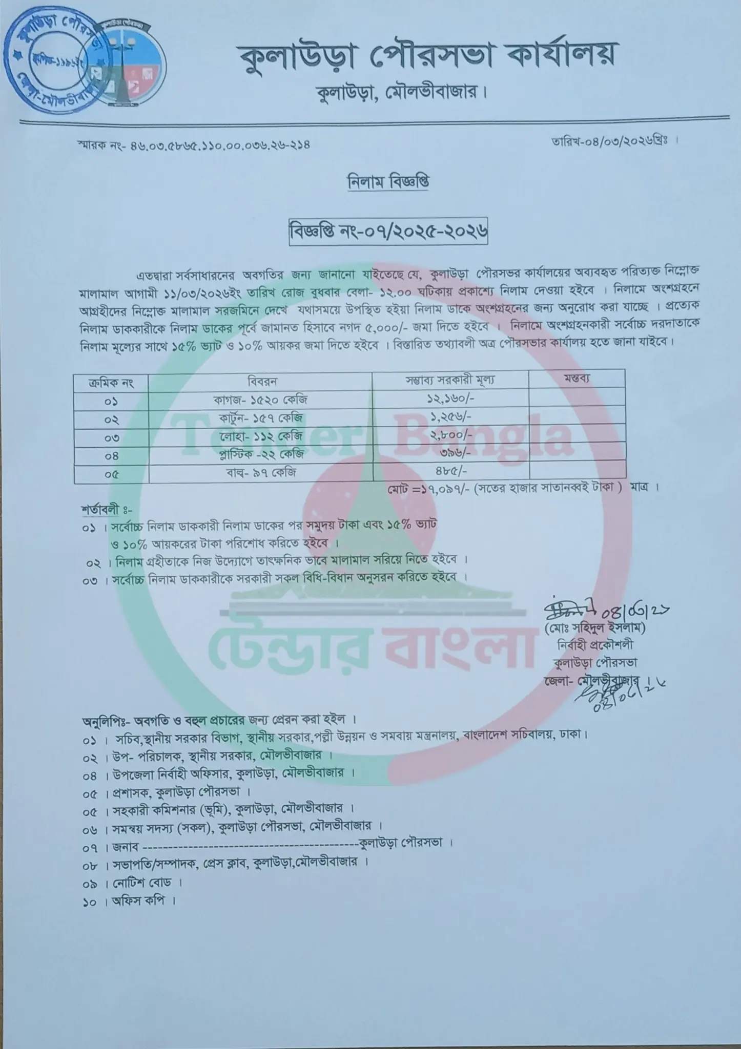 Title: বিভিন্ন মালামাল নিলাম বিজ্ঞপ্তি কুলাউড়া পৌরসভা কার্যালয়