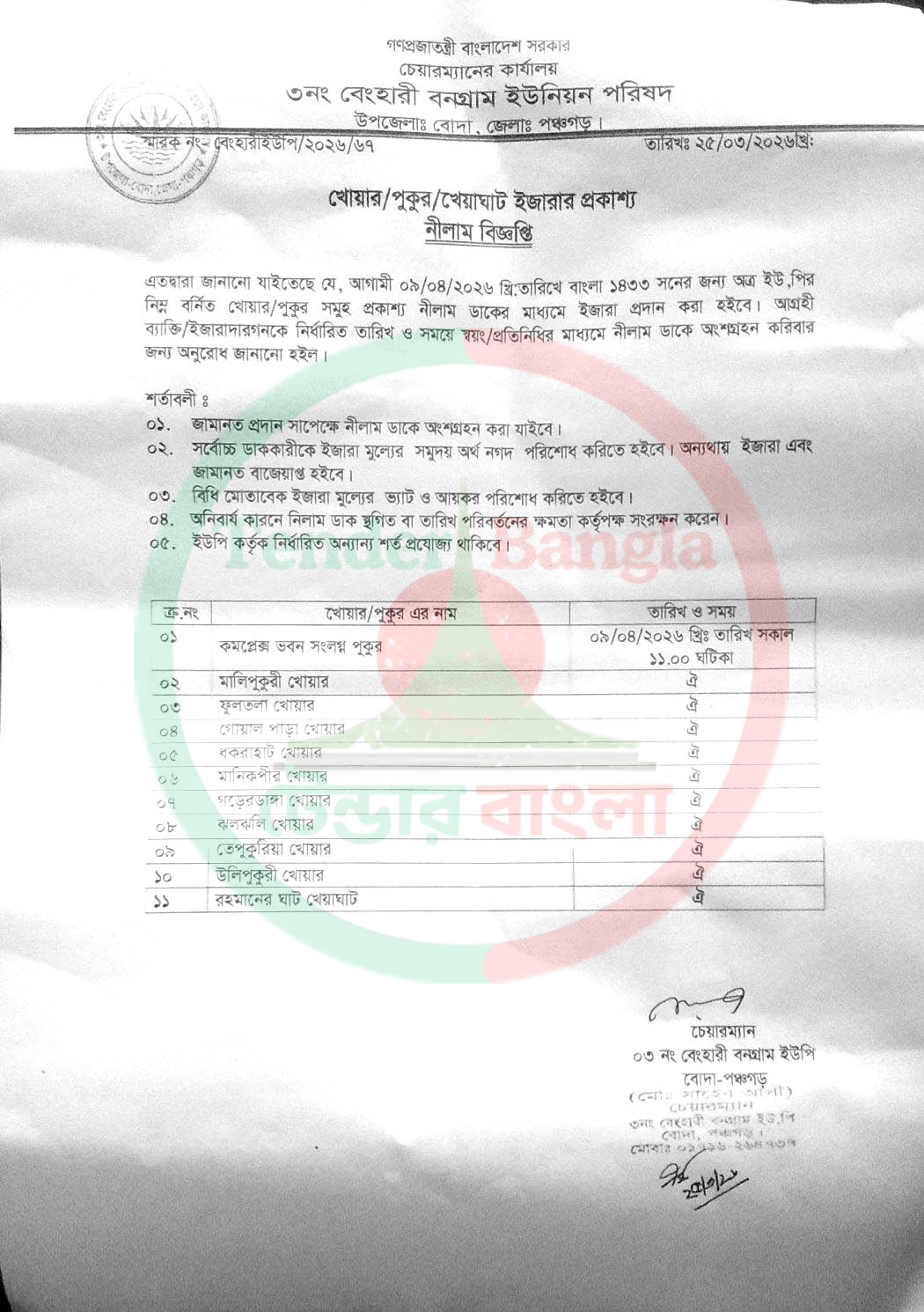Title: খোয়া/পুকুর ইজারার প্রকাশ্য নিলাম বিজ্ঞপ্তি