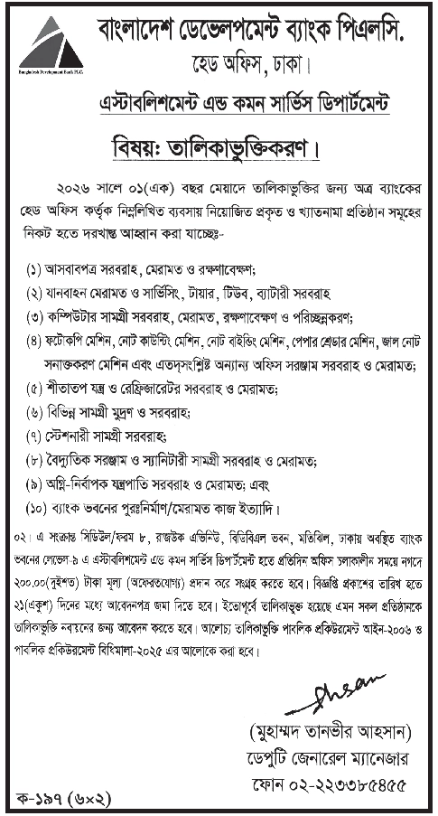 Title: বিভিন্ন ধরনের ব্যবসায়ী প্রতিষ্ঠান তালিকাভুক্তিকরণ বিজ্ঞপ্তি বিডিবিএল।