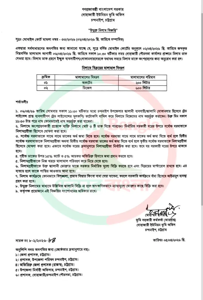 Title: ডিজেল ও অকটেন নিলাম বিজ্ঞপ্তি ভূমি অফিস