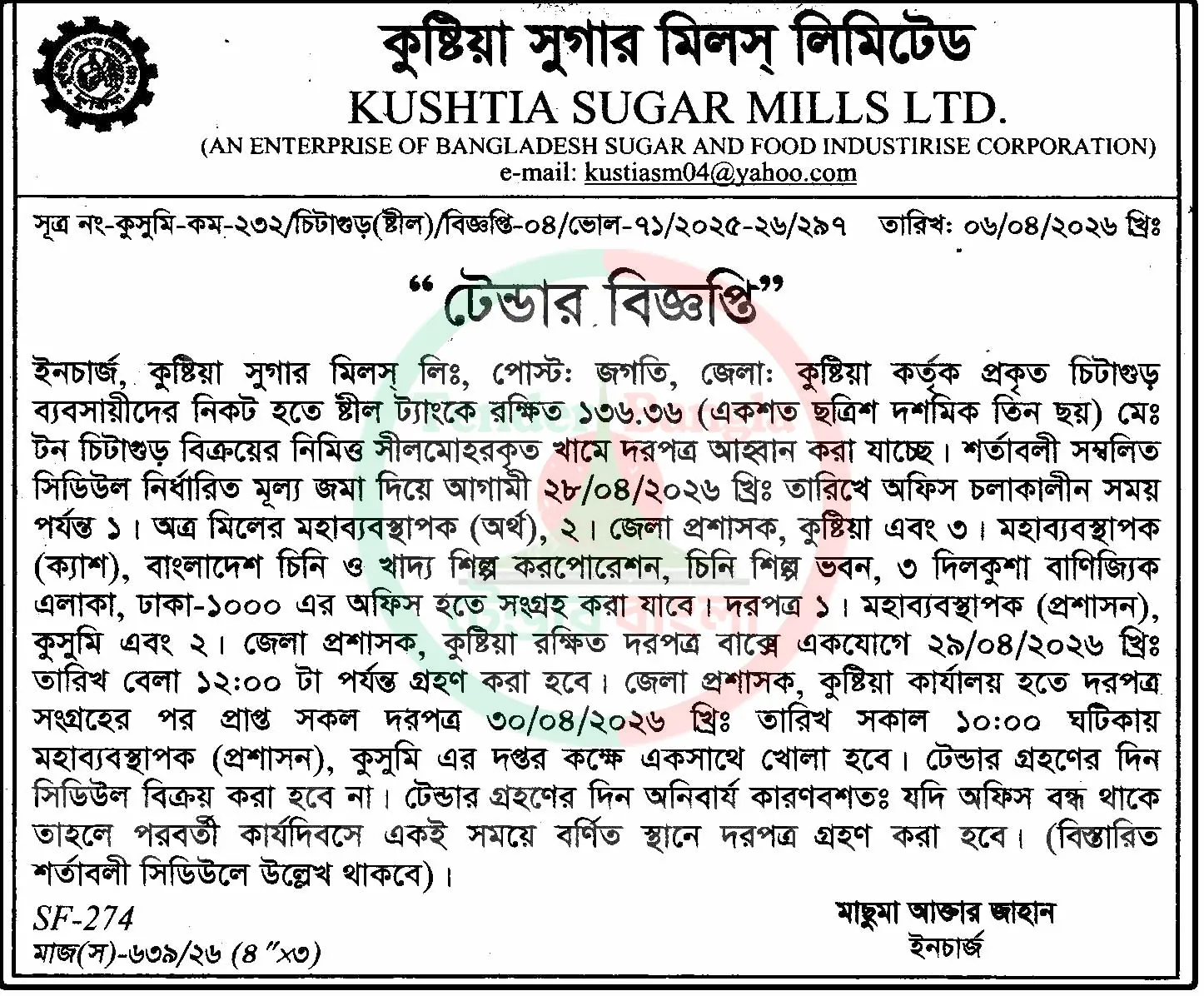 Title: চিটাগুড় বিক্রয়ের টেন্ডার বিজ্ঞপ্তি