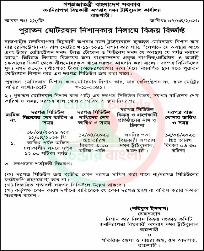 Title: পুরাতন মোটরযান নিলাম বিক্রয় বিজ্ঞপ্তি