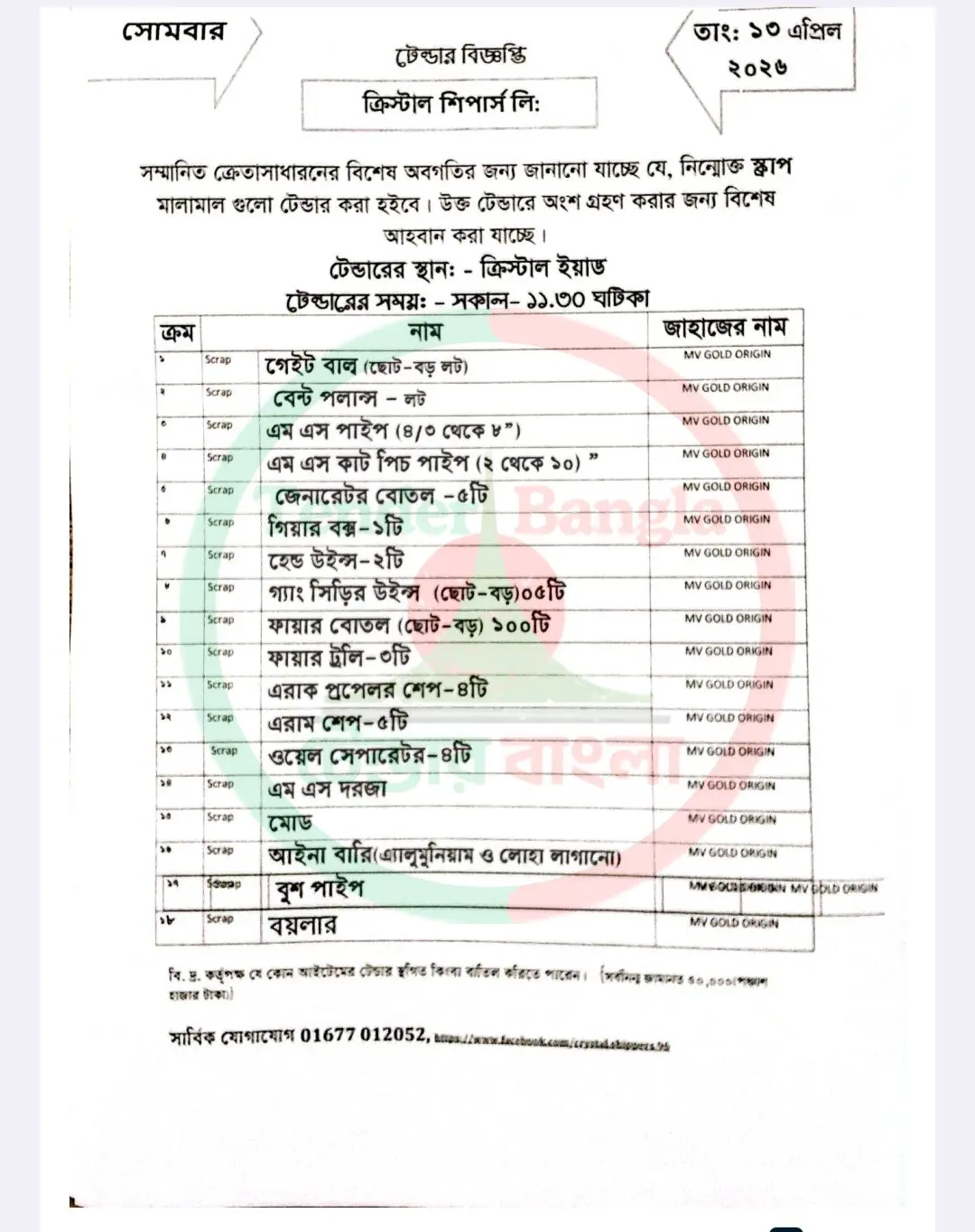 Title: বিভিন্ন স্ক্র্যাপ মালামাল টেন্ডার বিজ্ঞপ্তি ক্রিস্টাল শিপার্স লি.