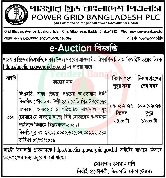 Title: বিভিন্ন ধরনের ই অকশন বিজ্ঞপ্তি পাওয়ার গ্রিড বাংলাদেশ পিএলসি