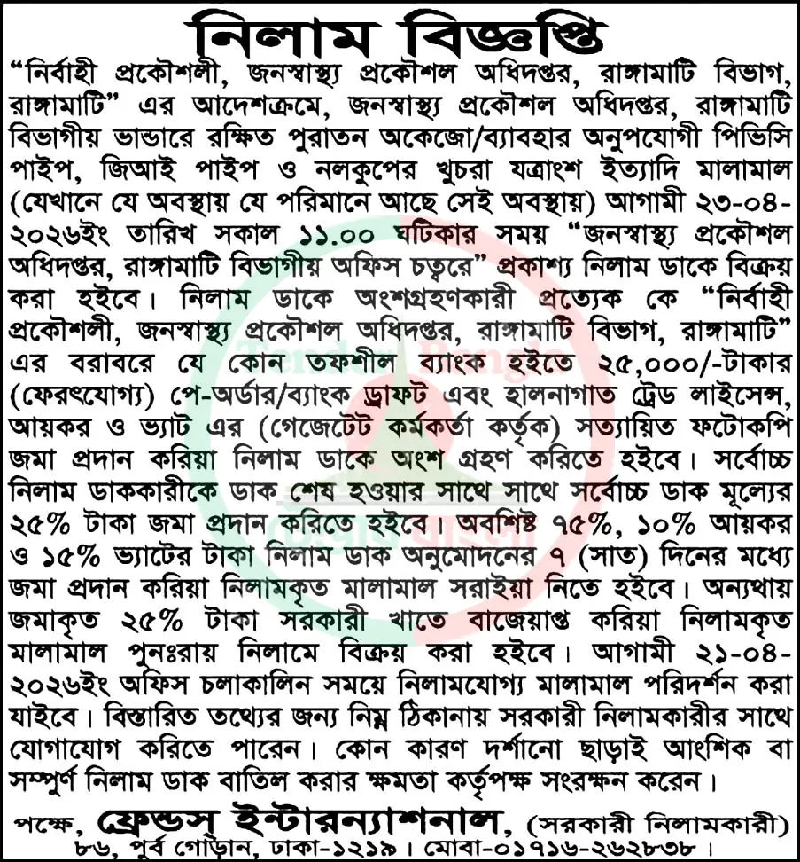 Title: পুরাতন অকেজো বিভিন্ন পিভিসি পাইপ, জিআই পাইপ ও নলকুপের খুচরা যত্রাংশ ইত্যাদি মালামাল নিলাম বিজ্ঞপ্তি