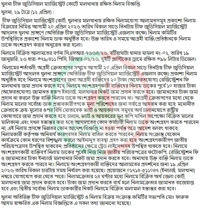 Title: চীফ জুডিসিলা ম্যাজিস্ট্রেট কোর্ট বিভিন্ন মালামাল নিলাম বিজ্ঞপ্তি