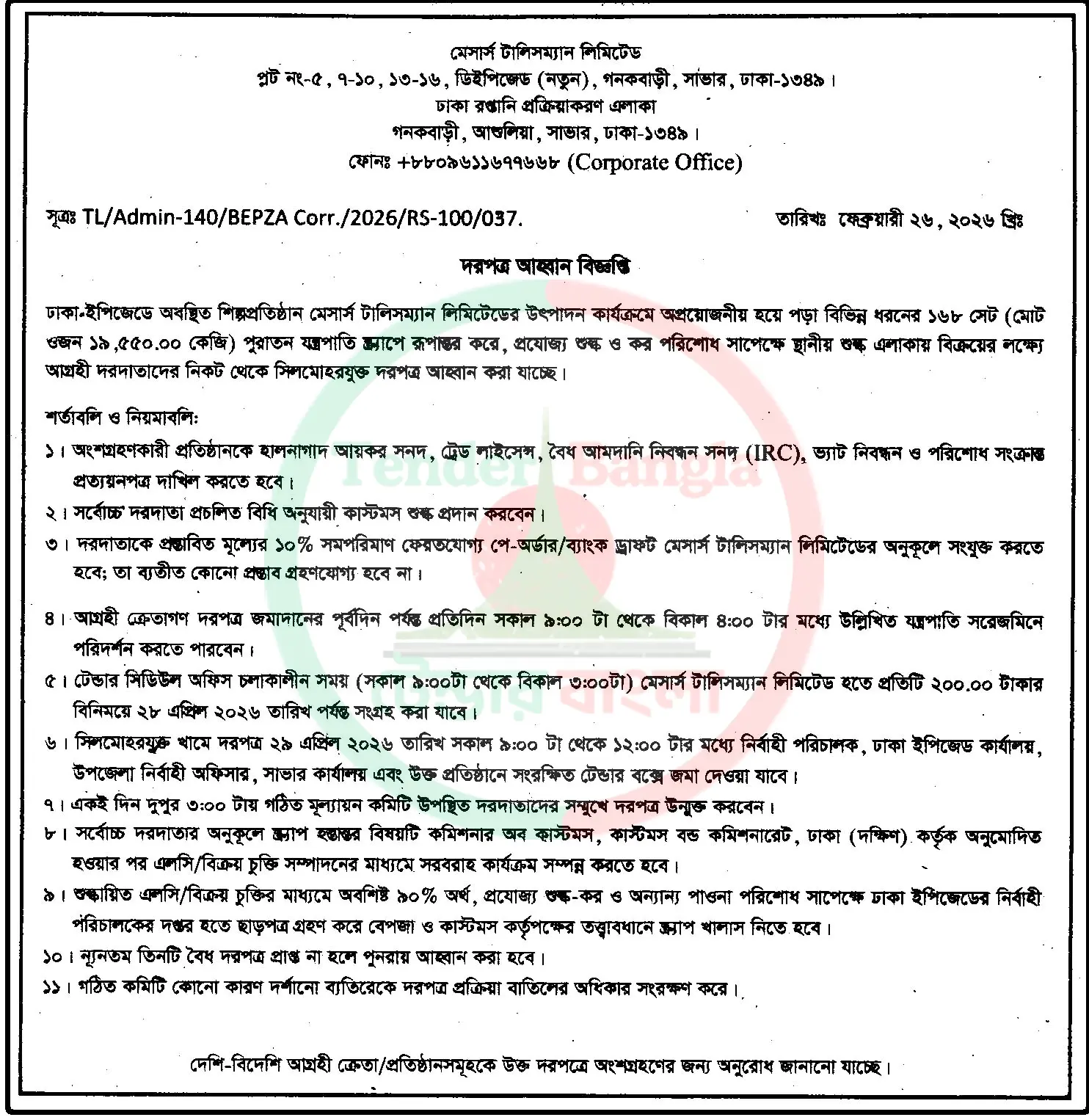 Title: বিভিন্ন ধরনের স্ক্র্যাপ মালামাল বিক্রয়ের দরপত্র বিজ্ঞপ্তি মেসার্স টালিসম্যান লিমিটেড সাভার