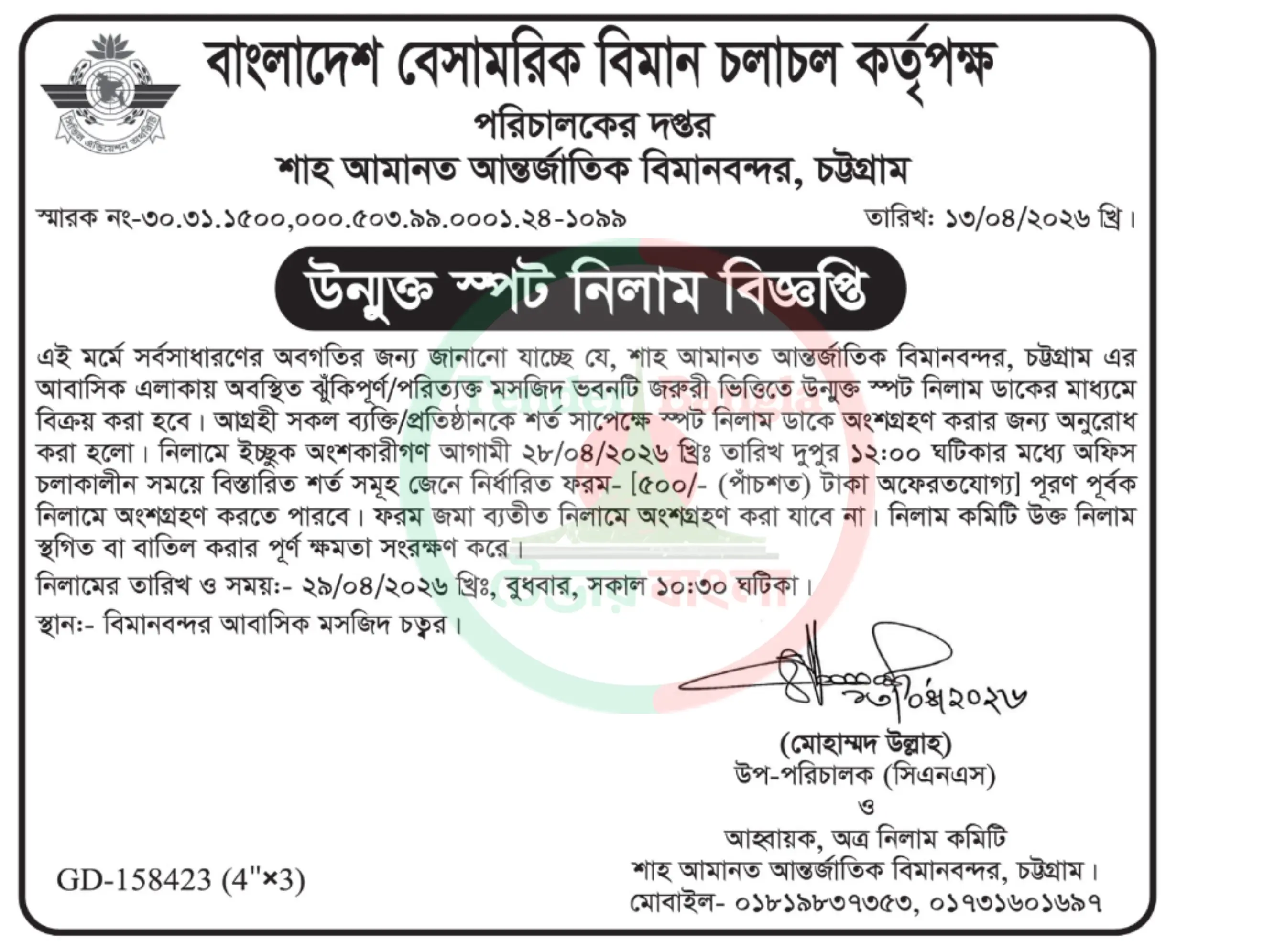 Title: স্পট নিলাম বিজ্ঞপ্তি বেসামরিক বিমান চলাচল কৃর্তপক্ষ