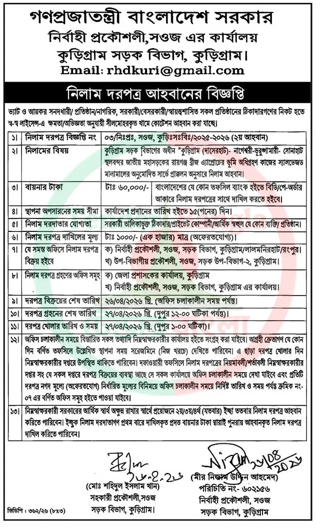 Title: নিলাম দরপত্র বিজ্ঞপ্তি কুড়িগ্রাম সড়ক বিভাগ