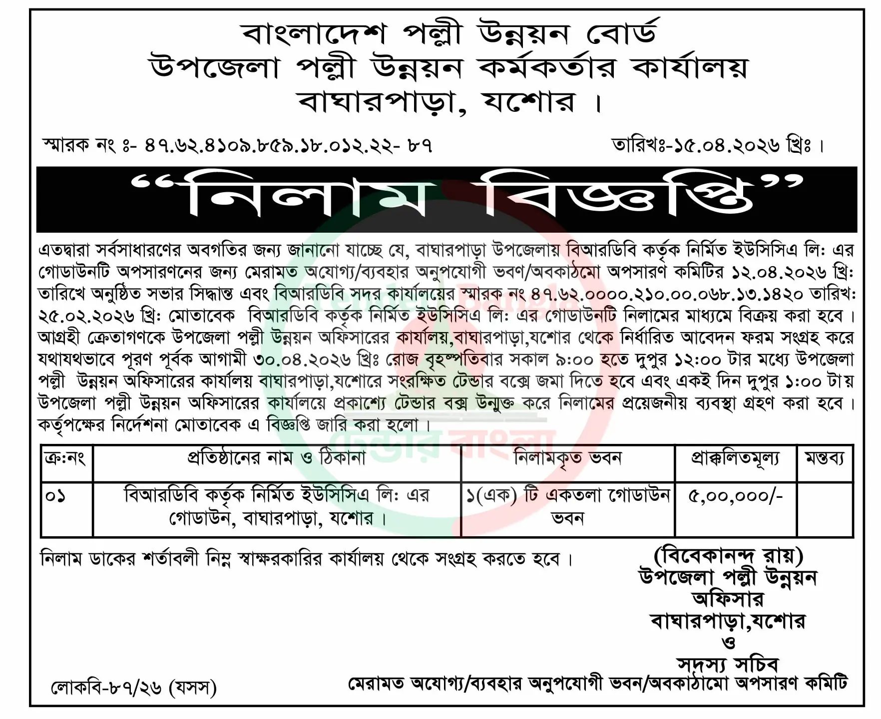 Title: বিভিন্ন ধরনের স্থাপনা/অবকাঠামো নিলাম বিজ্ঞপ্তি পল্লী উন্নয়ন অফিস বাঘারপাড়া