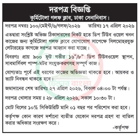Title: ডিপ টিউব ওয়েল খননের দরপত্র বিজ্ঞপ্তি , ঢাকা সেনানিবাস।