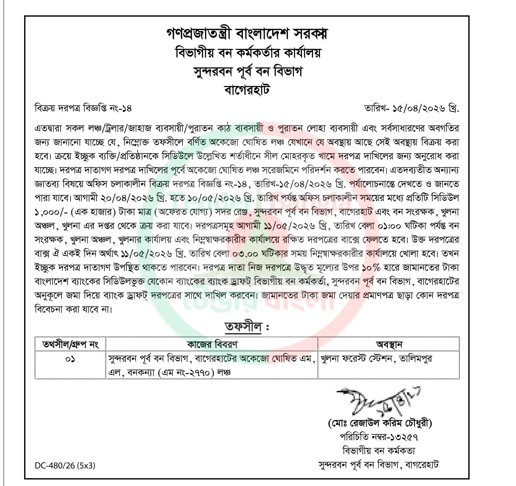 Title: লঞ্চ বিক্রয়ের দরপত্র বিজ্ঞপ্তি