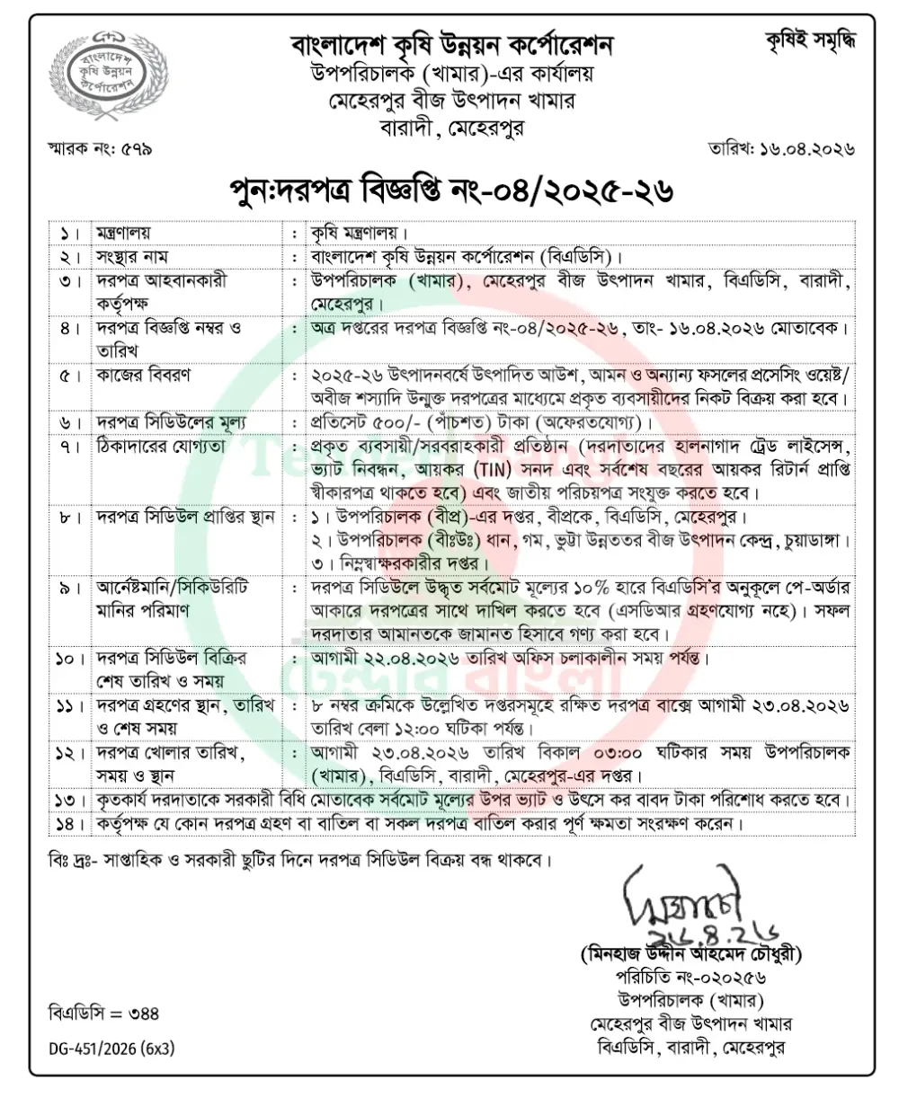 Title: ফসলের ওয়েষ্ট বিক্রয়ের পুনঃদরপত্র বিজ্ঞপ্তি
