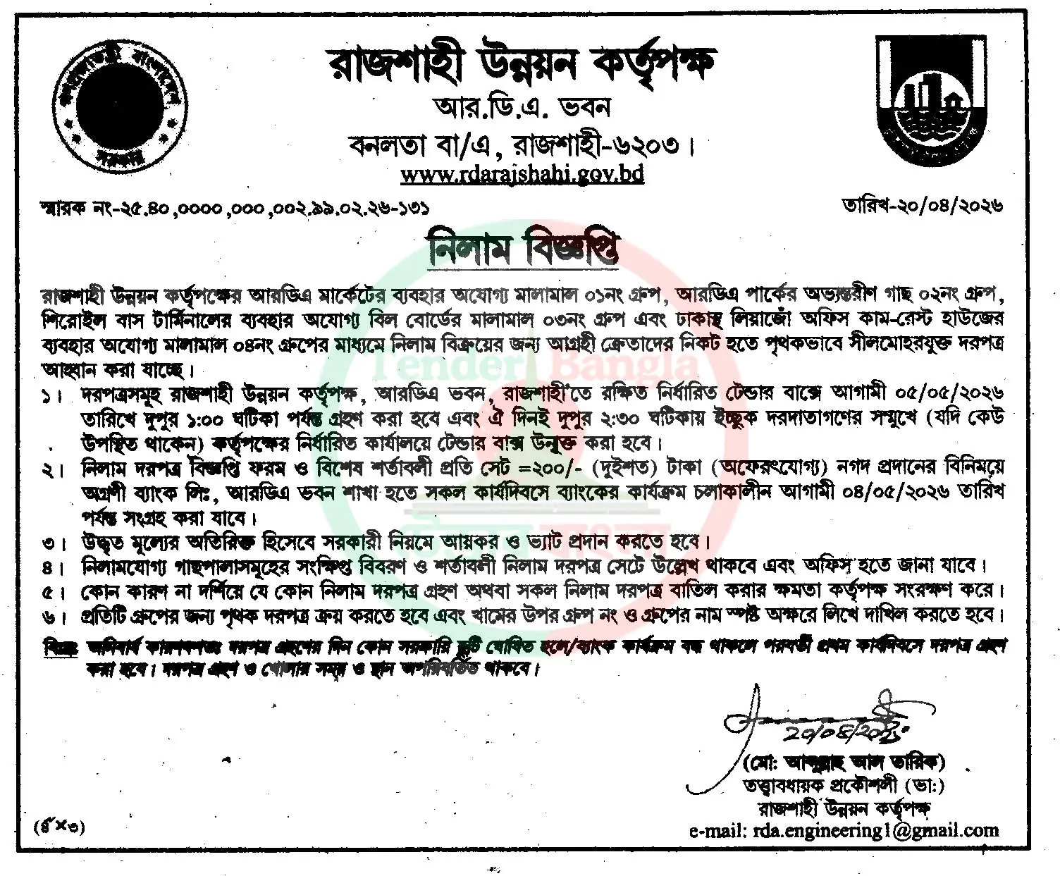 Title: গাছ ও বিভিন্ন মালামাল নিলাম বিজ্ঞপ্তি