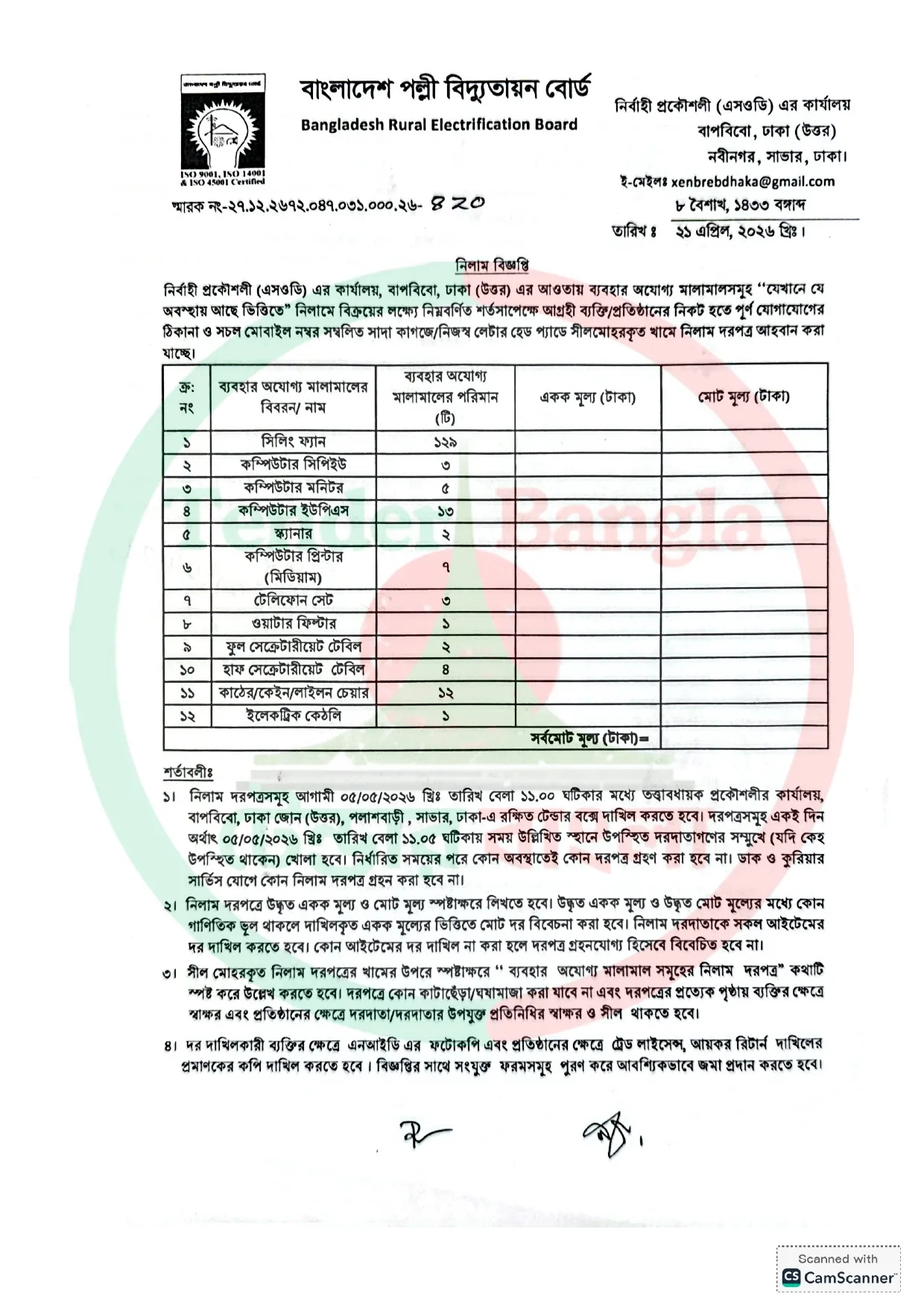 Title: বিভিন্ন ধরনের মালামাল নিলাম বিজ্ঞপ্তি পল্লী বিদ্যুতায়ন বোর্ড