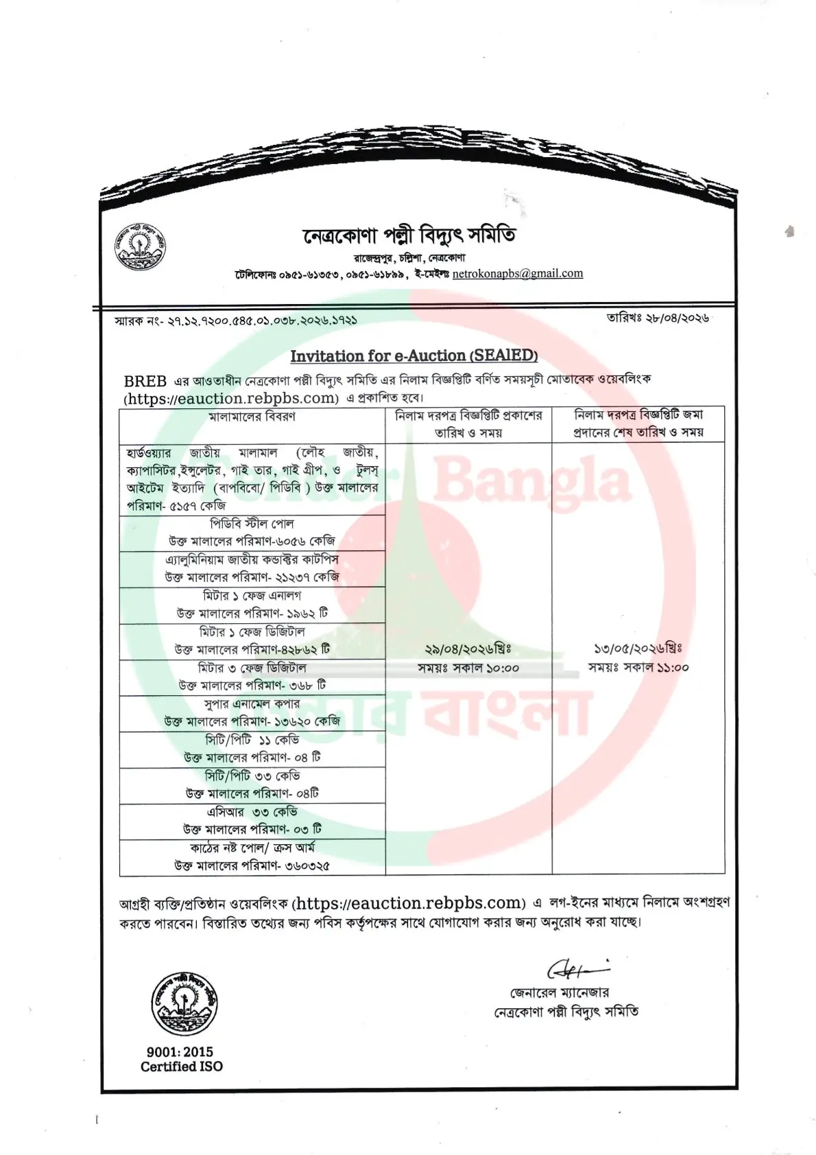 Title: পল্লী বিদ্যুৎতের বিভিন্ন ধরনের মালামাল নিলাম বিজ্ঞপ্তি ( ই অকশন)