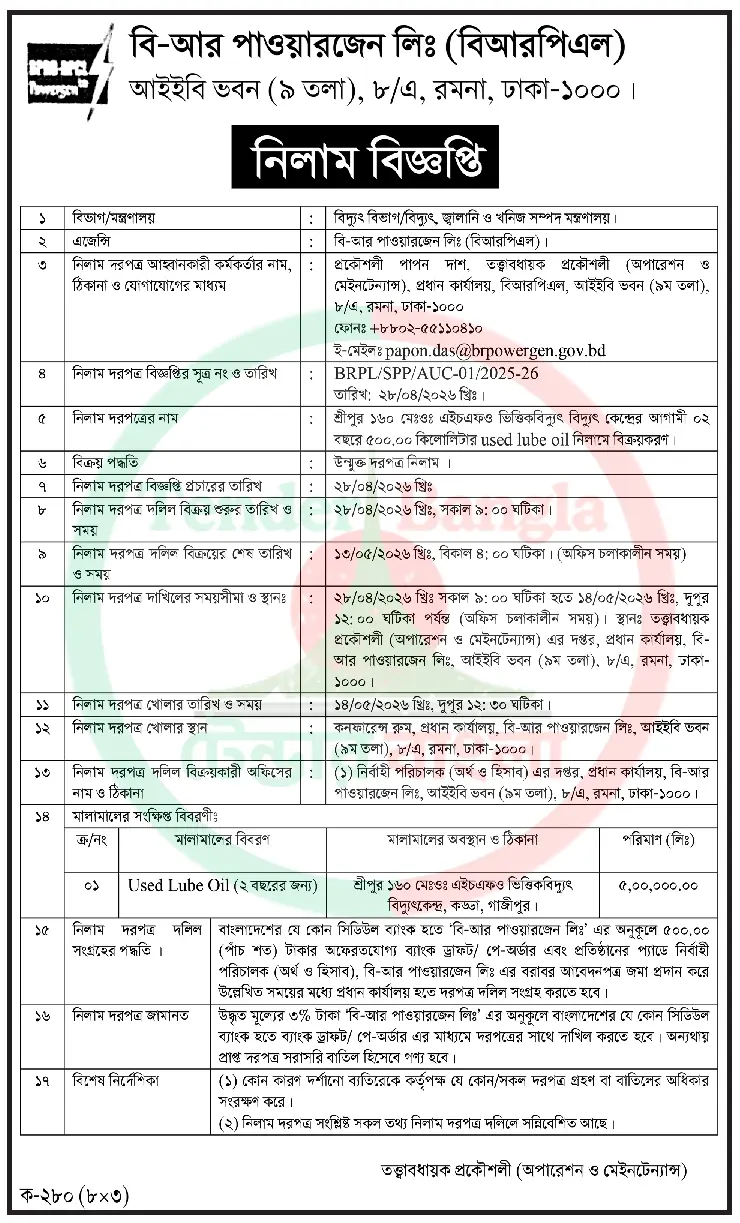 Title: লুব ওয়েল নিলাম বিজ্ঞপ্তি বি আর পাওয়ারজেন লিঃ