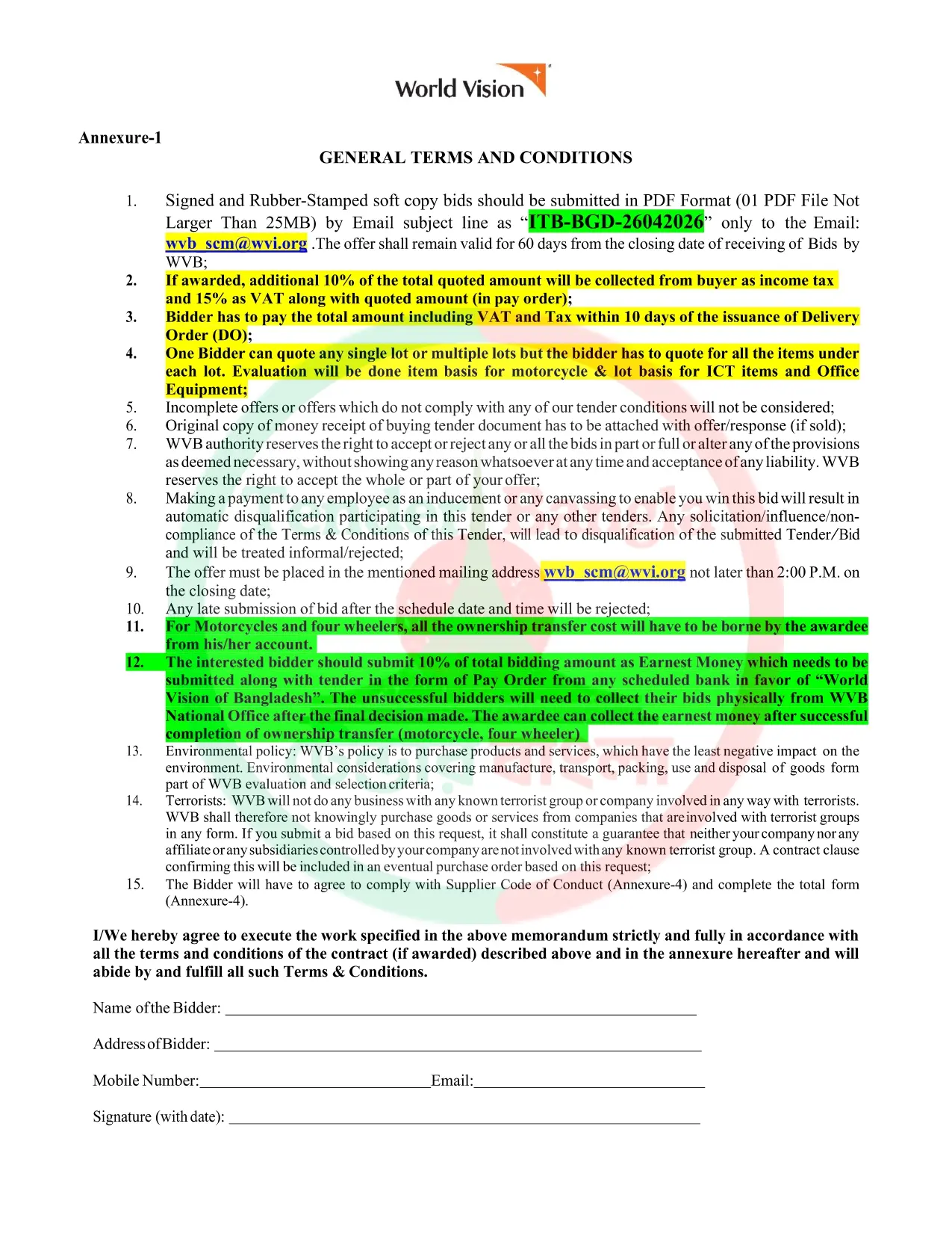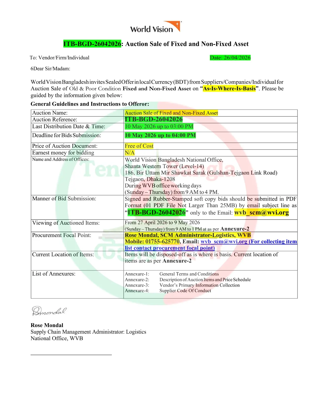 Title: ওয়াল্ড ভিশন বিভিন্ন বিভিন্ন এসেট , মালামাল অকশন বিজ্ঞপ্তি