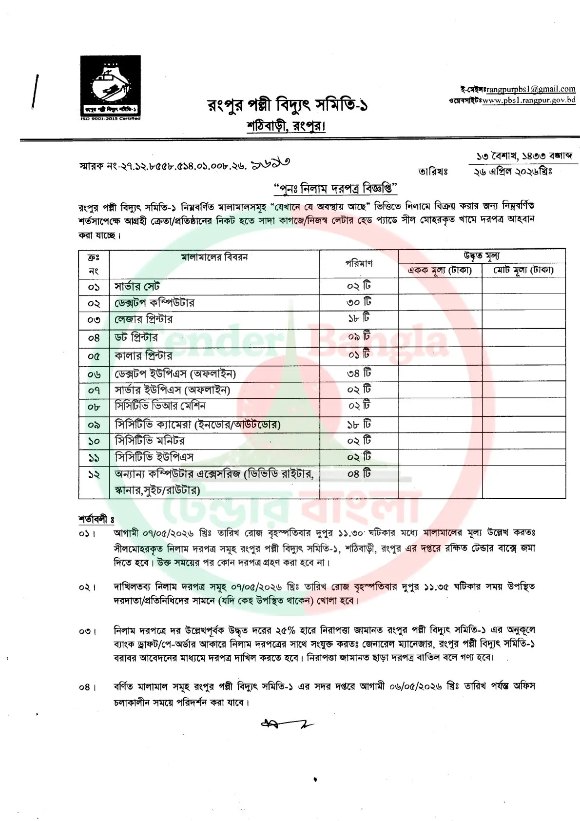 Title: পল্লী বিদ্যুৎতের বিভিন্ন ধরনের মালামাল বিক্রয় বিজ্ঞপ্তি