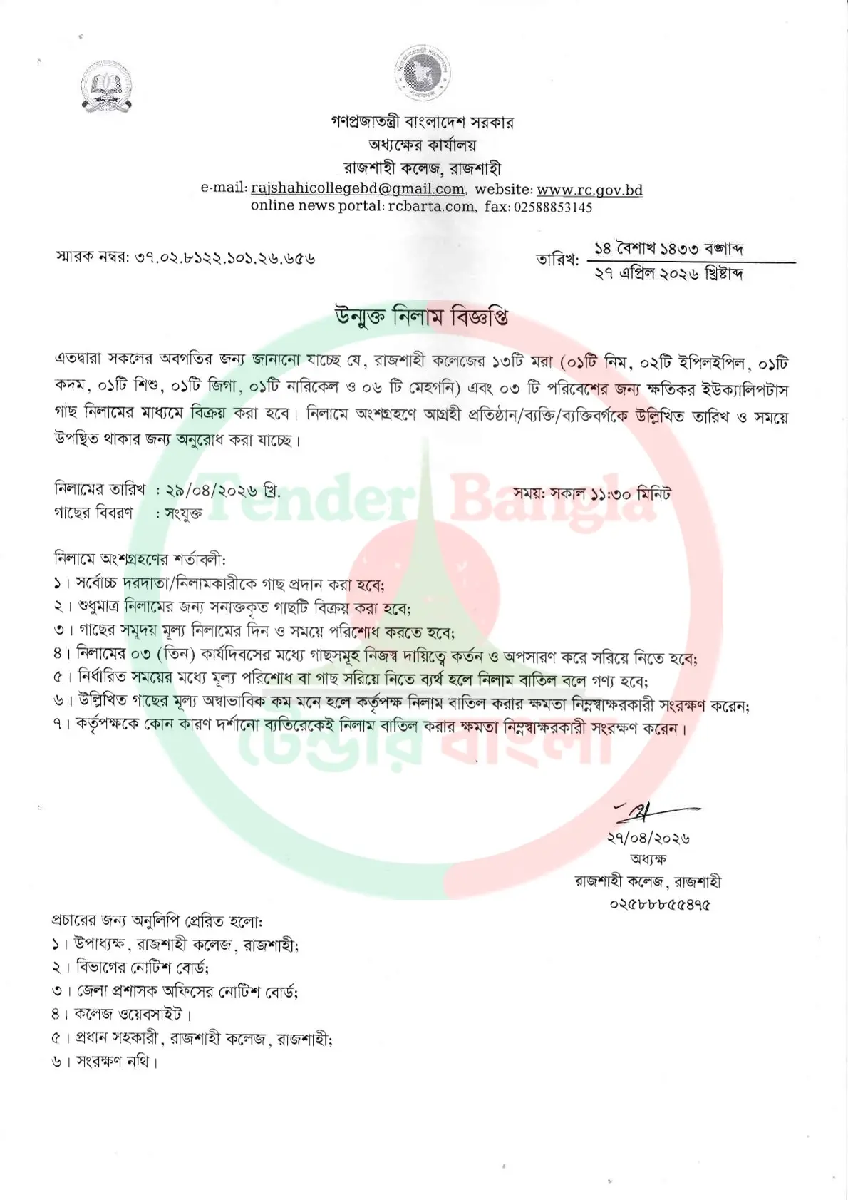 Title: বিভিন্ন ধরনের গাছ প্রকাশ্য নিলাম বিজ্ঞপ্তি রাজশাহী কলেজ