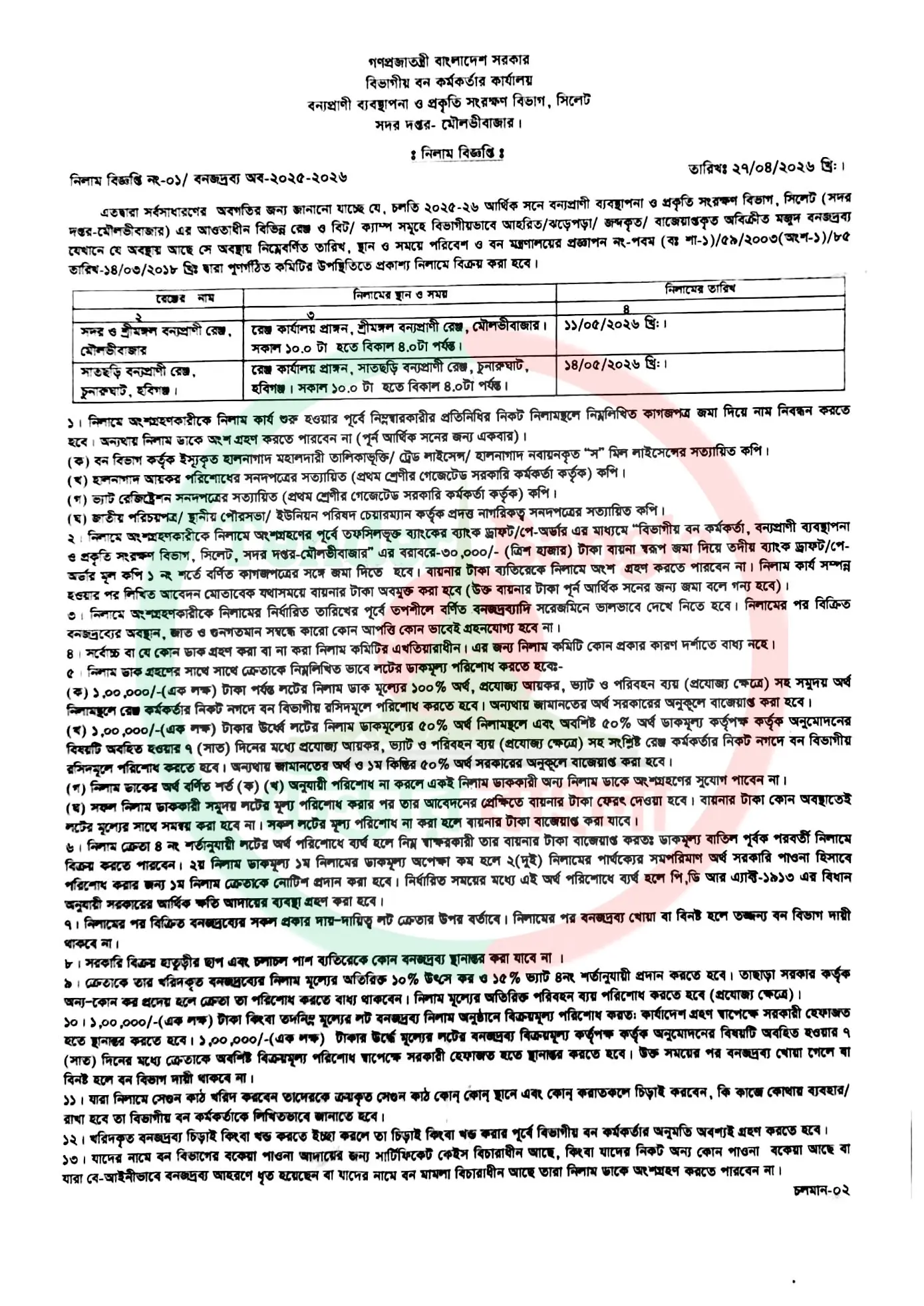 Title: বিভিন্ন ধরনের গাছ, বনজদ্রব্য নিলাম বিজ্ঞপ্তি