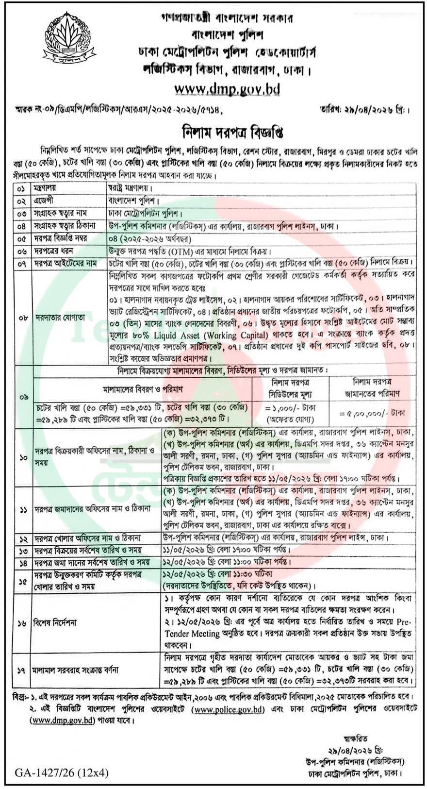 Title: খালি বস্তা নিলাম বিজ্ঞপ্তি পুলিশ