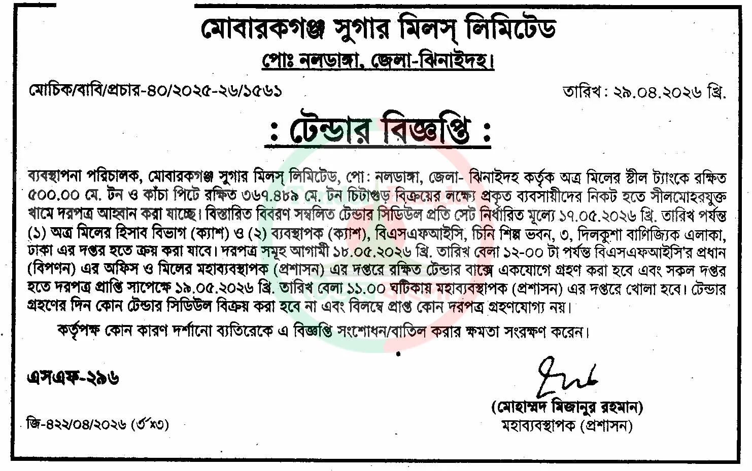 Title: চিটাগুড় বিক্রয়ের টেন্ডার বিজ্ঞপ্তি