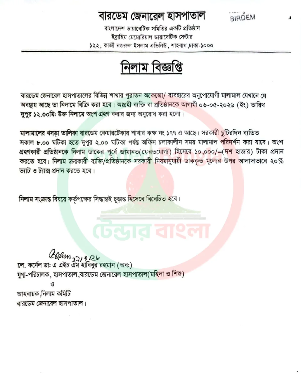 Title: বিভিন্ন ধরনের মালামাল নিলাম বিজ্ঞপ্তি বারডেম জেনারেল হাসপাতাল